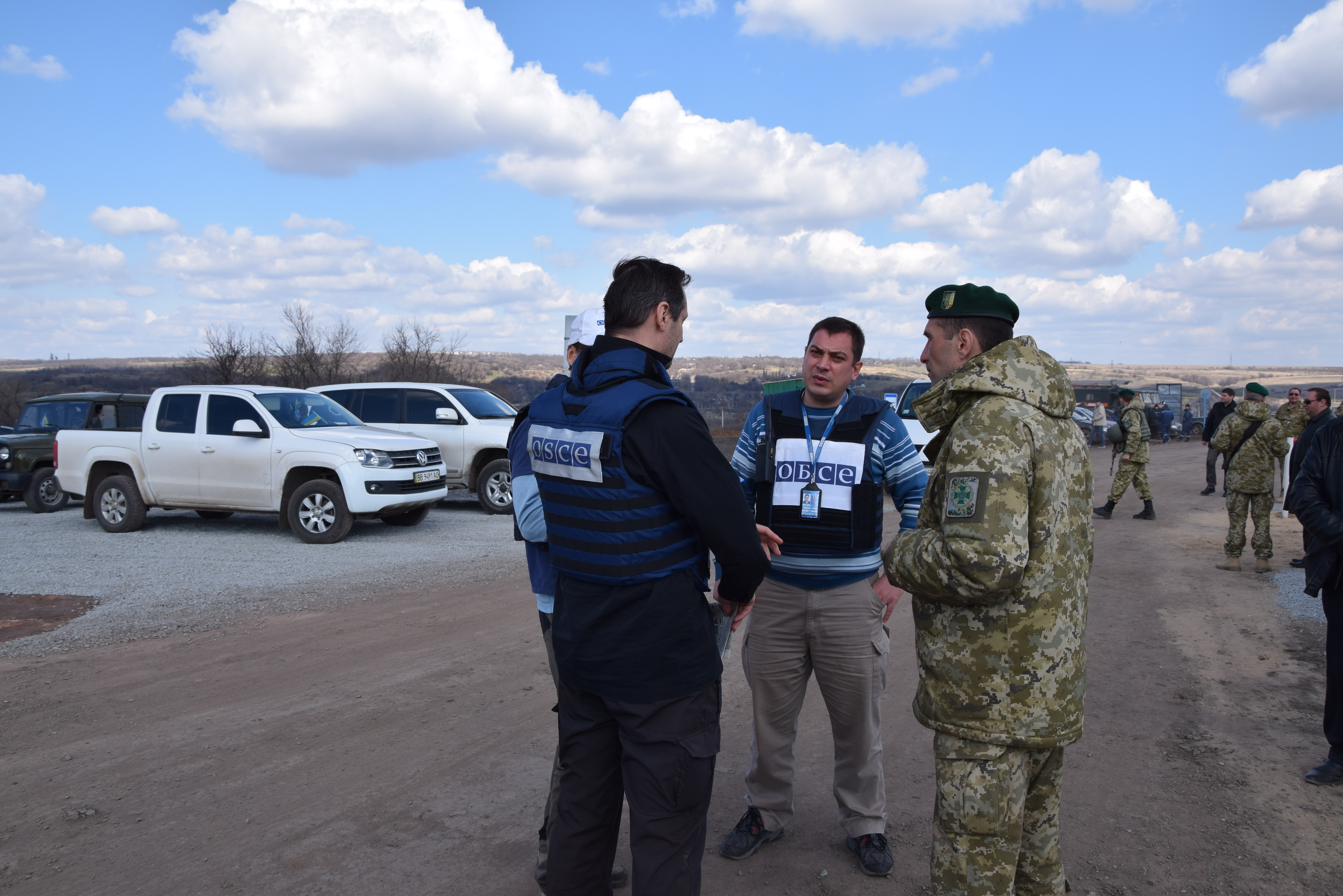 Появившимся ОБСЕшникам детально рассказывают о сложившейся ситуации. Те обещают передать информацию своим коллегам на «той стороне» и тихонечко исчезают.