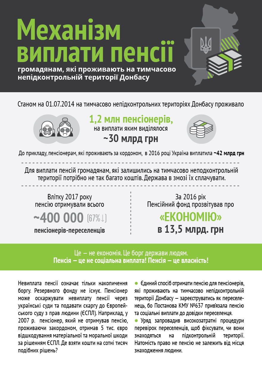 Насправді ще в листопаді 2014 року урядом було прийнято рішення прив’язати можливість отримання пенсії для громадян, які в 2014 проживали на сьогоднішніх непідконтрольних територій Донбасу до необхідності реєструватися як внутрішньо переміщена особа. Не залежно від того де ця особа проживає наразі. На практиці це означало наступне: пенсіонер виїжджав на підконтрольну територію, отримував довідку внутрішньо переміщеної особи, ставав на облік в управлінні пенсійного фонду та поновлював виплати своєї пенсії. Пенсія надходила на банківську картку, а пенсіонер повертався додому. Про такий механізм цілком відкрито заявляв попередній міністр соціальної політики Павло Розенко, зазначаючи, що вже в лютому 2015 року 900 тис. з 1,2 млн пенсіонерів отримували пенсію таким чином. «На жаль, державні органи, в тому числі Пенсійний фонд, не може фізично здійснити проплати на неконтрольованих українською владою територіях. Саме тому владою передбачено можливість отримати ці кошти на будь-якій іншій території» — здавалося, що у пана Розенко навіть сумнівів не було, що держава має виконувати обов’язок щодо пенсійного забезпечення своїх громадян, що, до речі, закріплено Конституцією України.