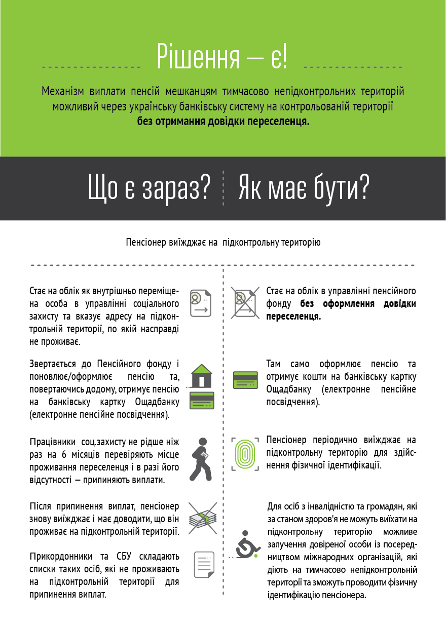 Єдиним дискусійним моментом залишився механізм забезпечення виплати пенсій тим, хто через інвалідність або поважний вік не в змозі виїжджати на підконтрольну територію. Але і тут є можливості вирішення для майбутнього — наприклад, застосування електронних засобів зв’язку (Skype) для видачі довіреностей, як це робиться в Грузії, а також для ідентифікації цих осіб, із можливим залученням міжнародних організацій, які працюють на тимчасово непідконтрольній території.