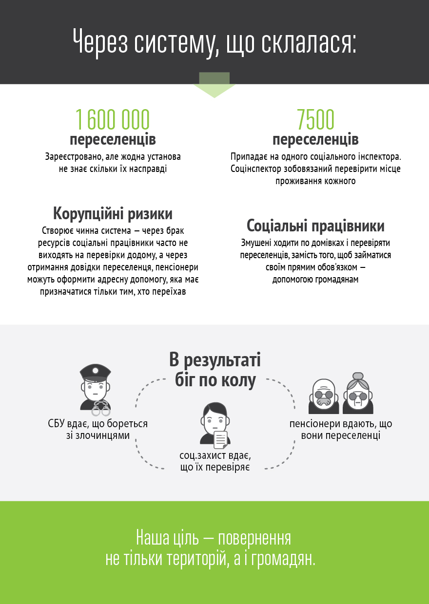 Отже продовжувати повторювати, що механізму немає — як мінімум смішно. Продовжувати зберігати систему, що склалася — це можливість кожного разу говорити про ‘шахраїв’, які отримують пенсію реєструючись як переселенець. Для того, що прибрати як справжніх шахраїв (адже сьогоднішня система відкриває можливості вимагання грошей від пенсіонерів, яким потрібно підтвердити несправжнє місце проживання для отримання насправді непотрібно їм довідки переселенця, а також можливості адресної допомоги, яка їм не має бути оформлена), так і припинити можливості звинувачень пенсіонерів в шахрайстві, якого вони на справді не здійснюють, потрібно надати можливість отримувати пенсію на підставі наявності українського паспорту, а не довідки.