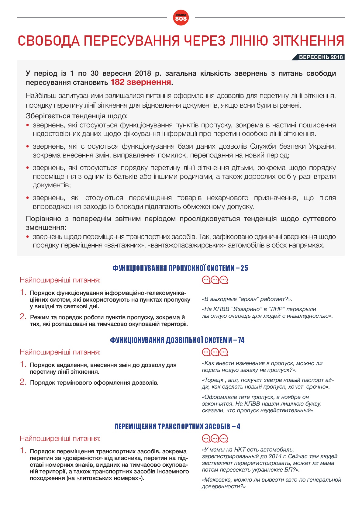 Одним із найпоширеніших звернень до Організації залишаються звернення з питань переміщення через лінію зіткнення. Так, у період з 1 по 30 вересня 2018 р. до нас надійшло 182 звернення на дану тему і це 6,5% від усіх звернень.