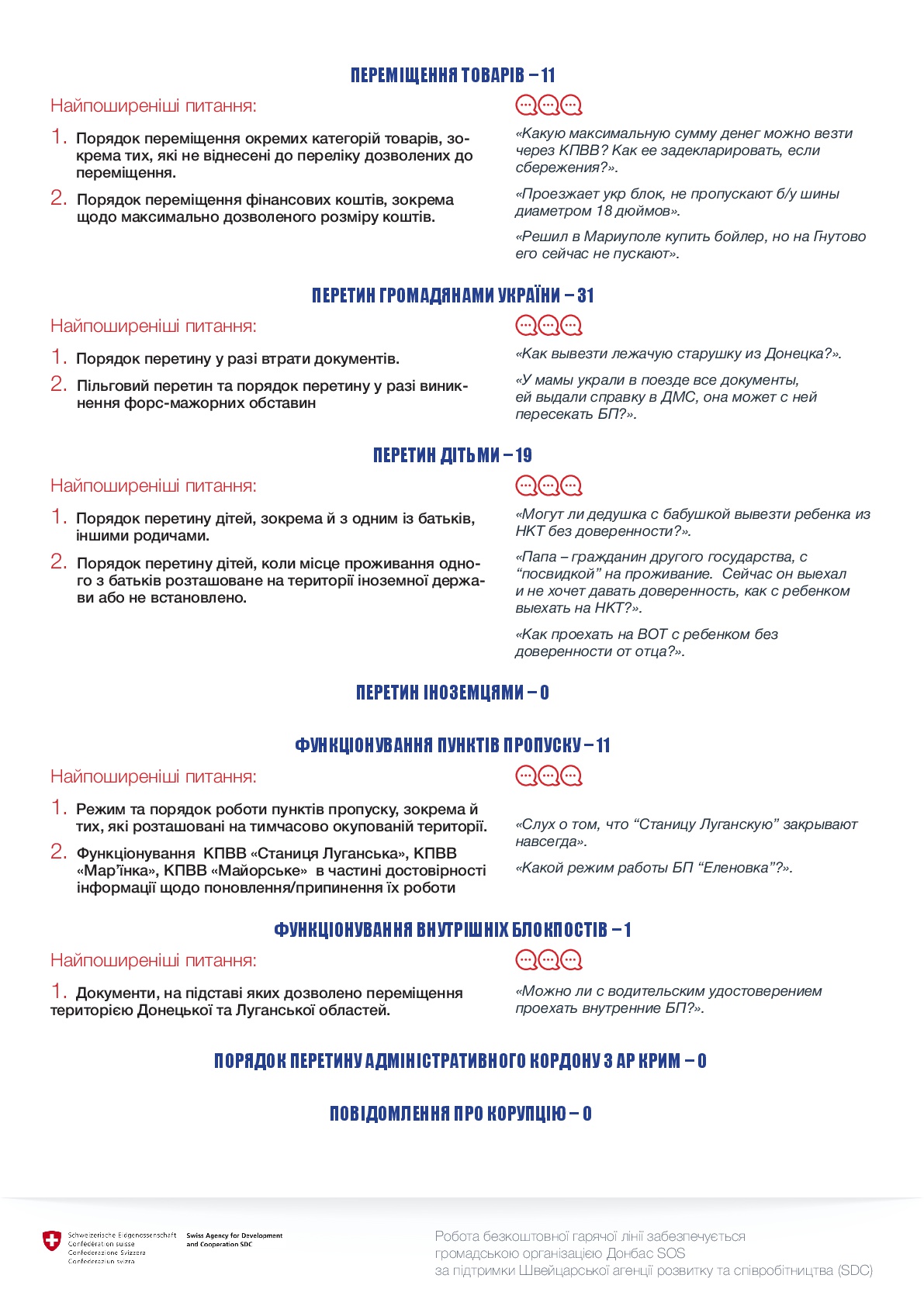 Суттєво зменшились звернення щодо порядку функціонування пунктів пропуску (Оскільки КПВВ “Станиця Луганська” на початку осені відновила свою роботу після реконструкції, а КПВВ “Майорське” не піддавалась обстрілам та закриттю) та порядку переміщення транспортних засобів.