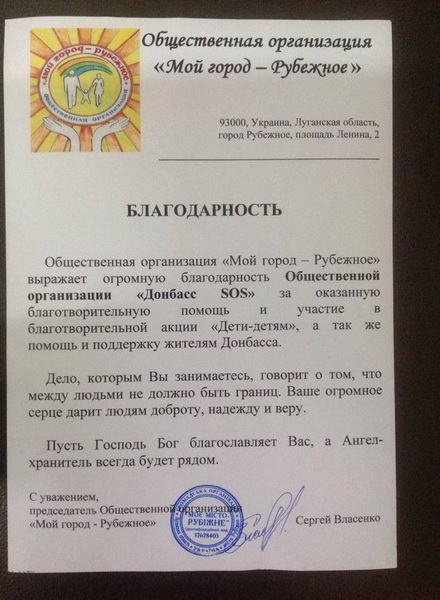Каждый день на горячую линию Донбасс SOS поступают звонки от тех, кто получил волонтерскую помощь. Особенно приятно, когда приходят такие благодарственные письма вместе с детскими рисунками. Добрые дела стали реальностью только благодаря Вашей поддержке, друзья.