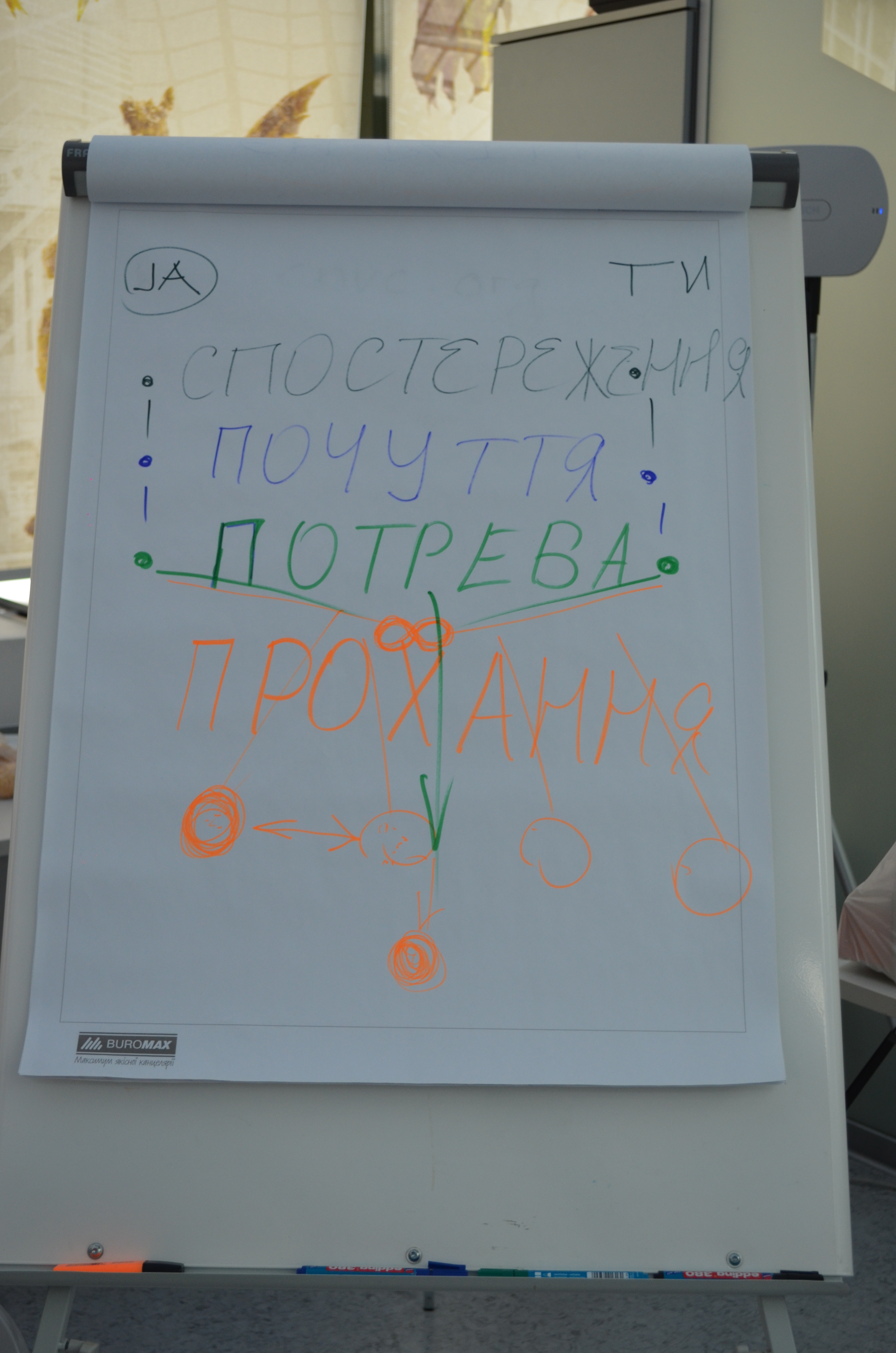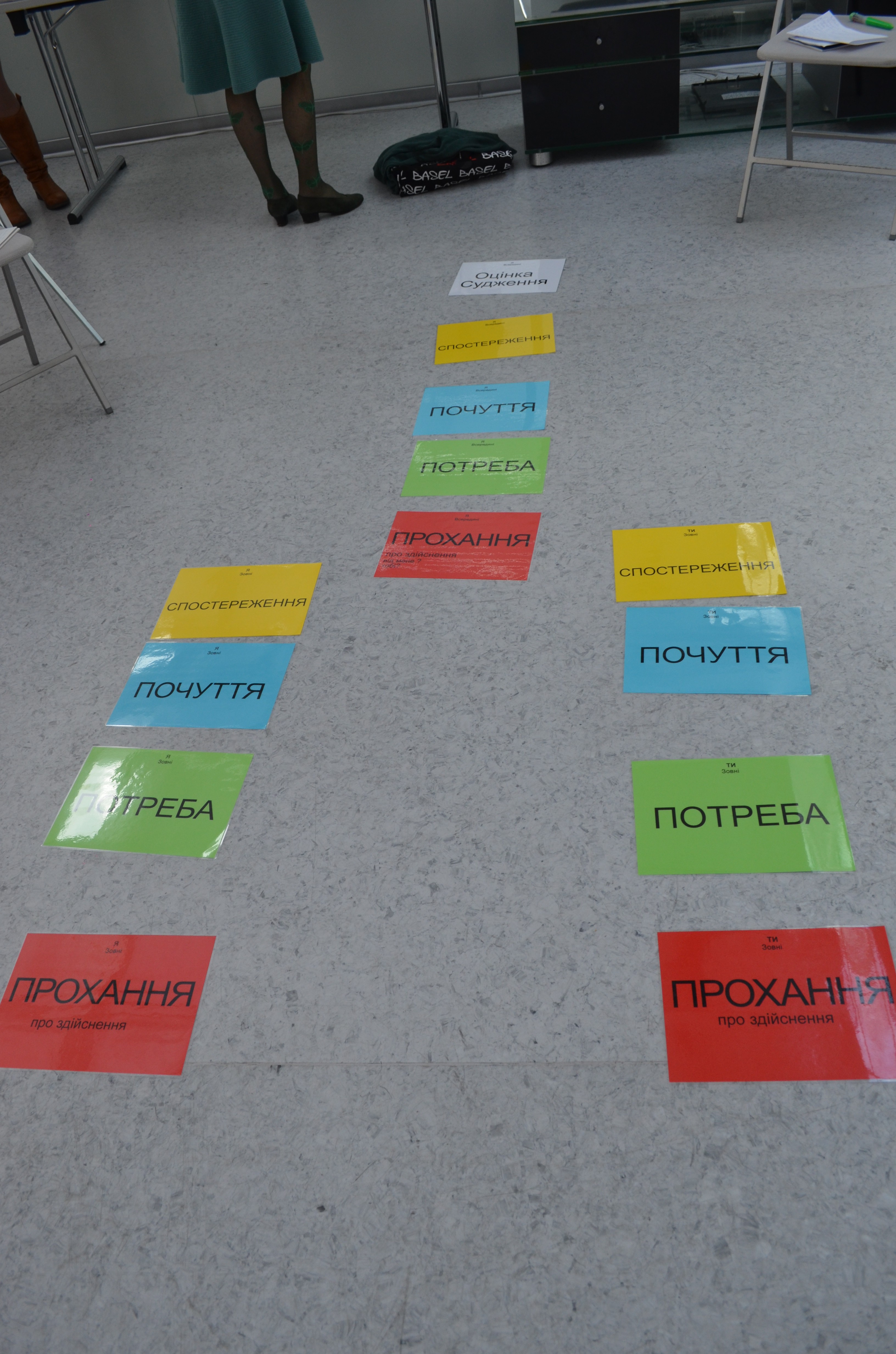 Шість продуктивних годин, організованих в гостинному приміщенні в самому центрі Києва, пролетіли мов декілька хвилин. Упродовж тренінгу швейцарський експерт Верена Єгер, яка приїхала на запрошення Центру “Простір Гідності”, познайомила сімнадцятьох учасників з основними правилами ненасильницького спілкування та приділила багато уваги практичній стороні методики. Зокрема, кілька реальних проблемних ситуацій, які запропонували учасники, були детально розібрані з точки зору мирного врегулювання та досягнення гармонії між сторонами конфлікту. Кольорові таблички у вправі “Танцпол” та спонтанний ляльковий театр “Діалог Вовка та Жирафа” наочно показали волонтерам, чим є справжній емпатичний діалог, мета якого – знайти мир і спокій у своїй душі та допомогти в цьому опонентові.