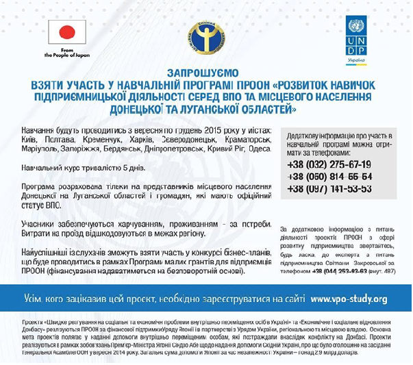 Внутрішньо переміщені особи Київської, Одеської, Харківської, Запорізької, Дніпропетровської, Полтавської та підконтрольних уряду України територіях Донецької та Луганської областей, а також місцеві Донецької та Луганської областей можуть взяти участь у 5-денних тренінгах для підвищення рівня практичної освіти в сфері підприємництва.