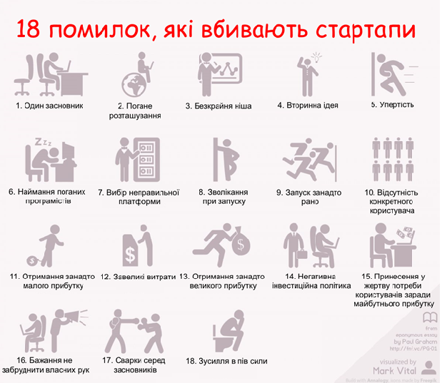 17. Сварки серед засновників – засновники дуже часто сперечаються. Це дуже амбіційні люди і тому вони завжди знаходяться на межі сварки. Потрібно знаходити компроміси.