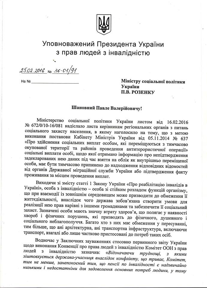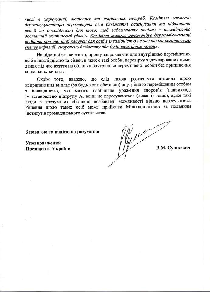 Ще в кінці лютого пан Сушкевич звернувся до міністра соціальної політики Павла Розенко з листом про неприпустимість призупинення соціальних виплат особам з інвалідністю, оскільки багато з них просто не зможуть особисто прийти до управлінь соц.захисту, тож змушені будуть чекати перевірки. А чекаючи на неї – будуть позбавленні часто єдиного джерела доходу.