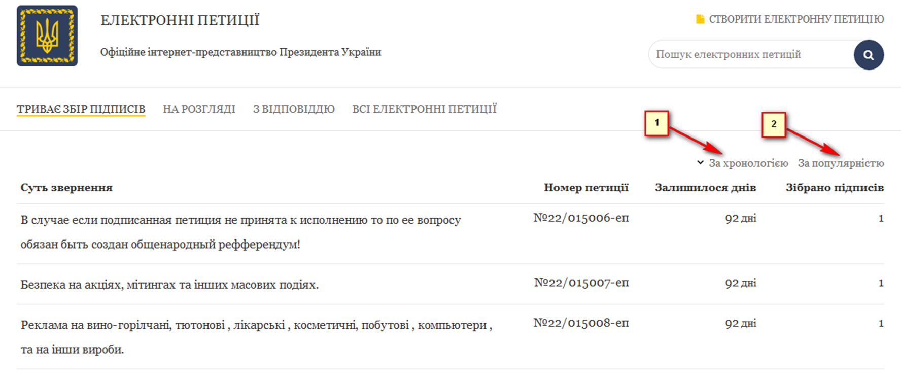 Здесь вы можете отсортировать петиции по хронологии или по популярности, нажав на соответствующую кнопку.