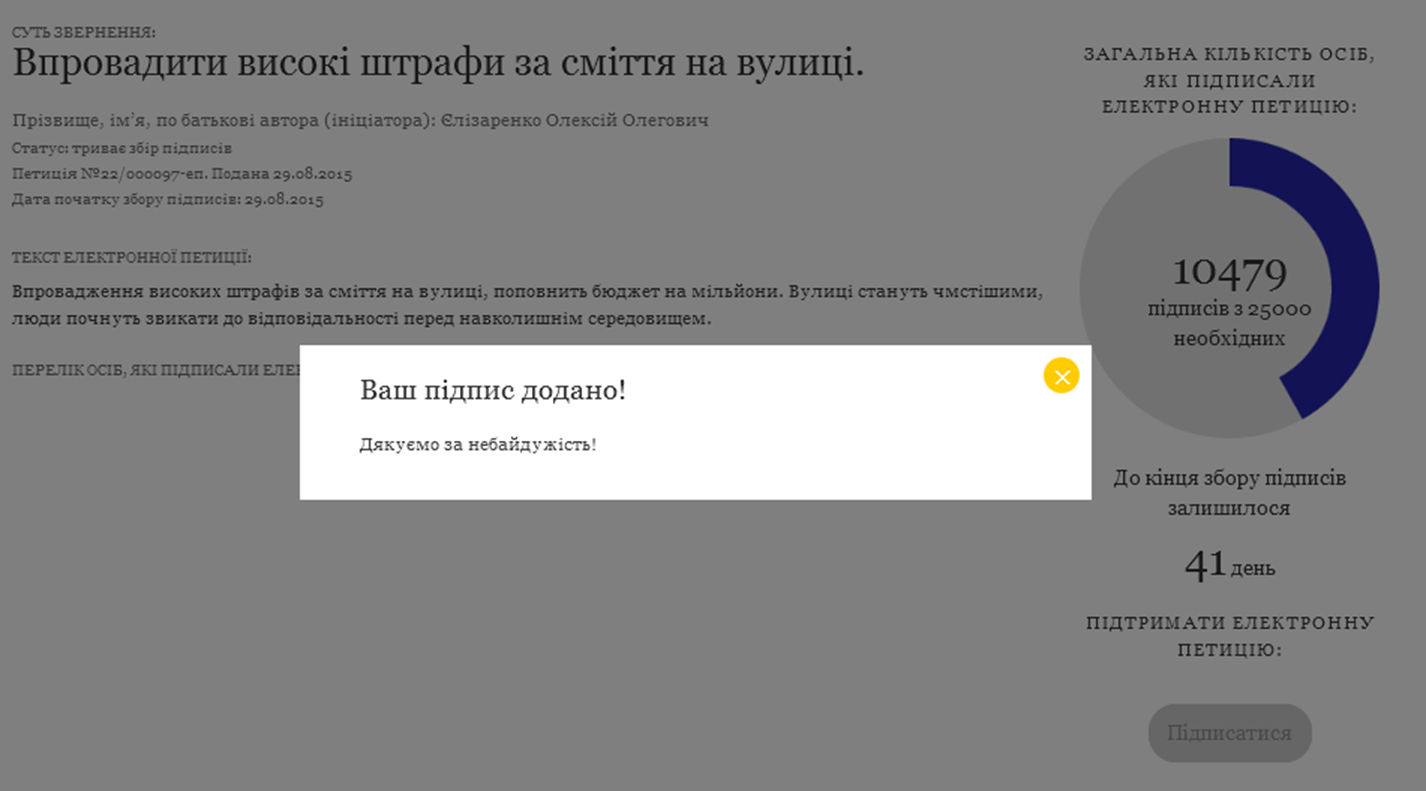 Перейдите на страницу той или иной петиций и в правой колонке нажмите на кнопку «Подписаться». После этого появится всплывающее окно о том, что вы успешно оставили свой голос.