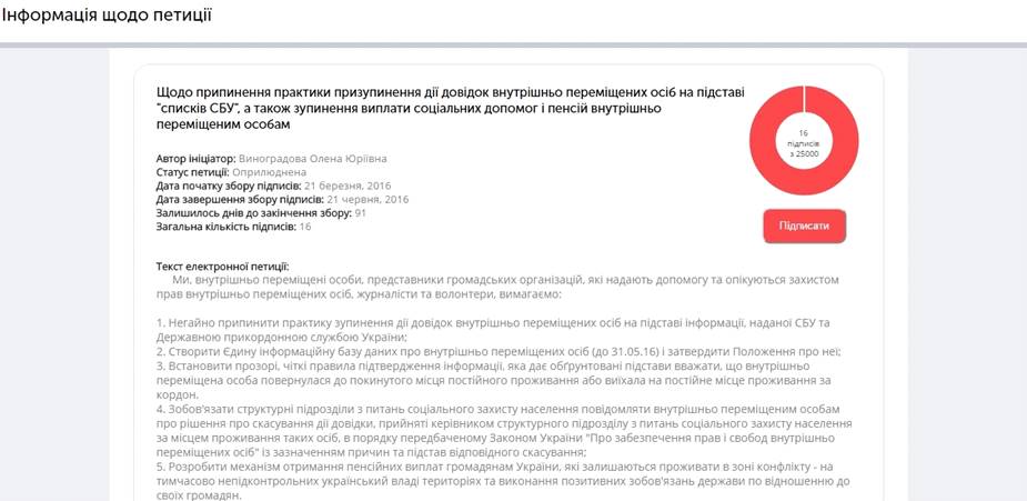 • Внимание: после входа на сайт, Вам откроются сразу все петиции. Нужная Вам петиция находится тут  и называется «Щодо припинення практики призупинення дії довідок внутрішньо переміщених осіб на підставі «списків СБУ», а також зупинення виплати соціальних допомог і пенсій внутрішньо переміщеним особам».