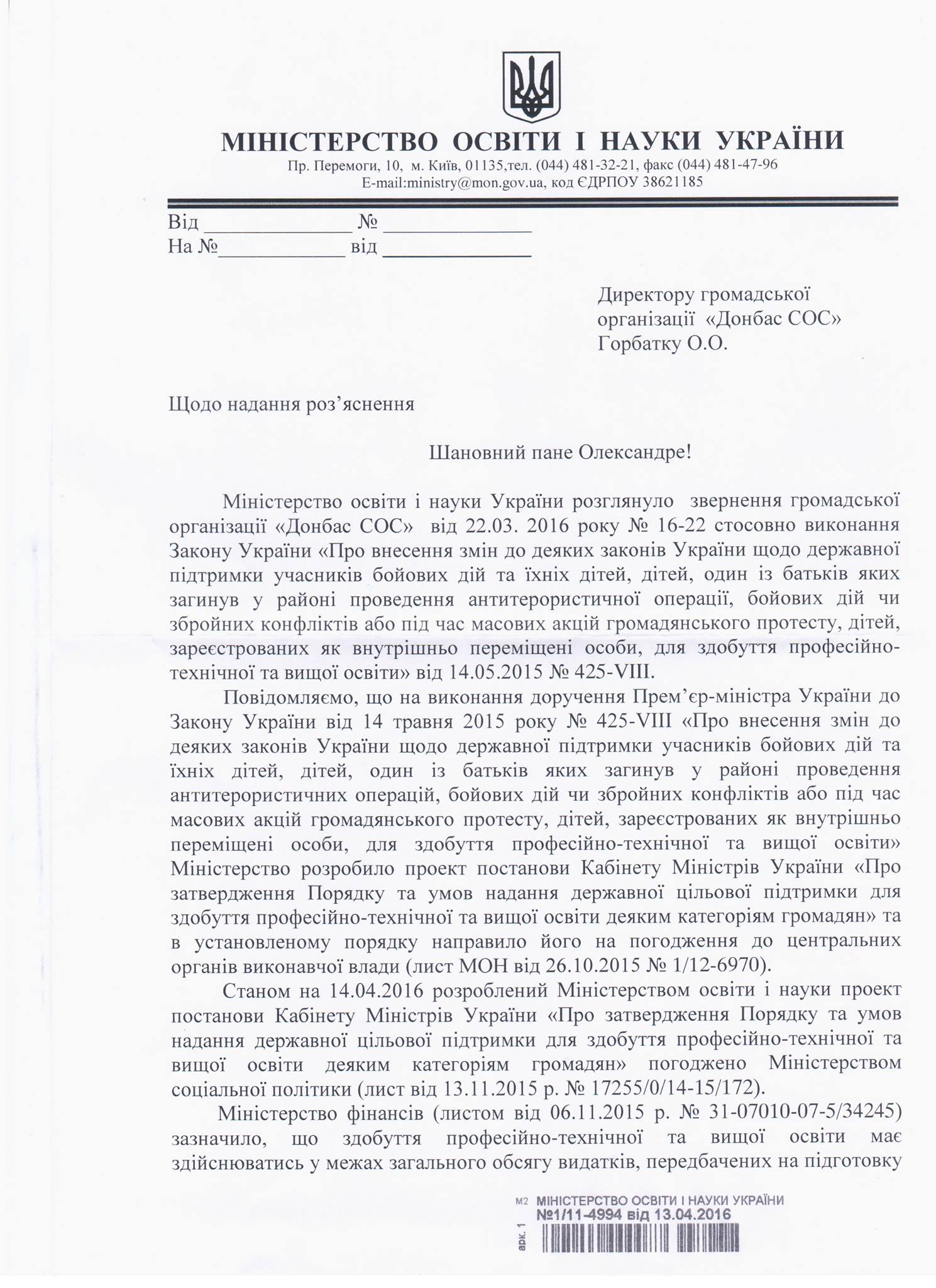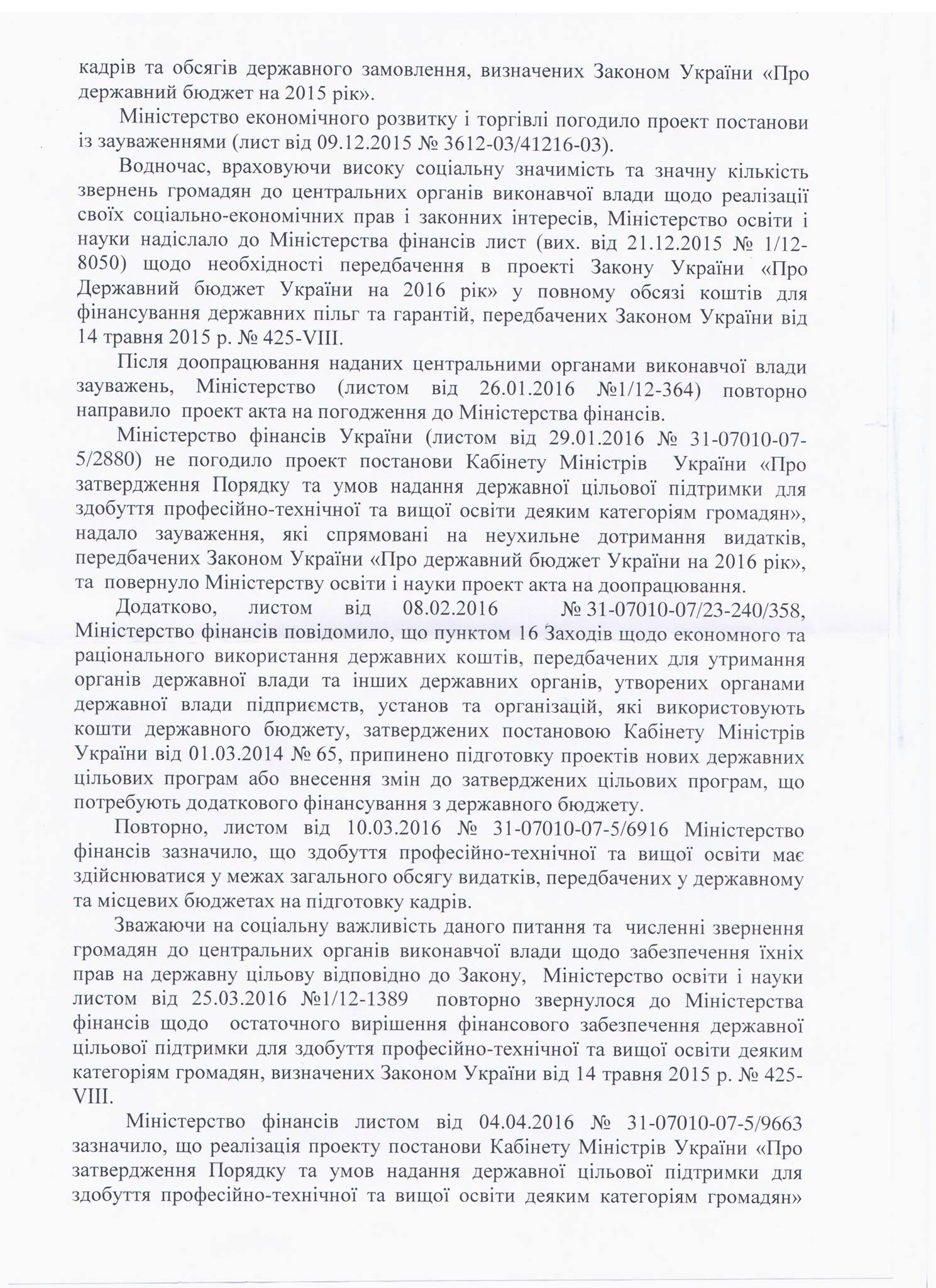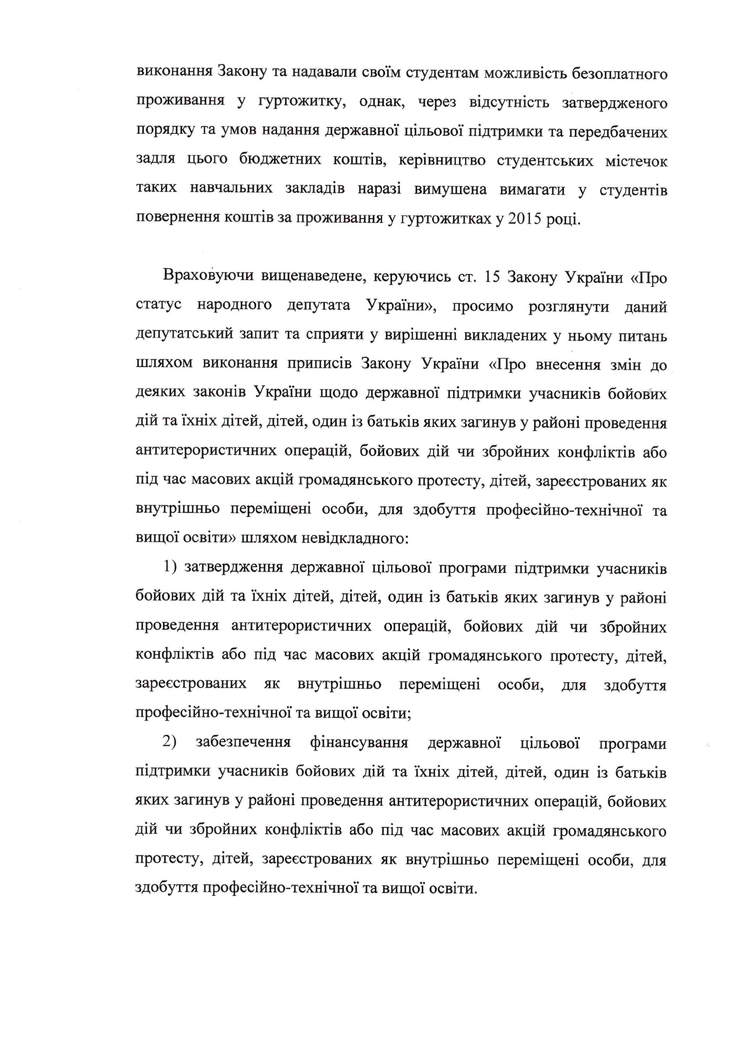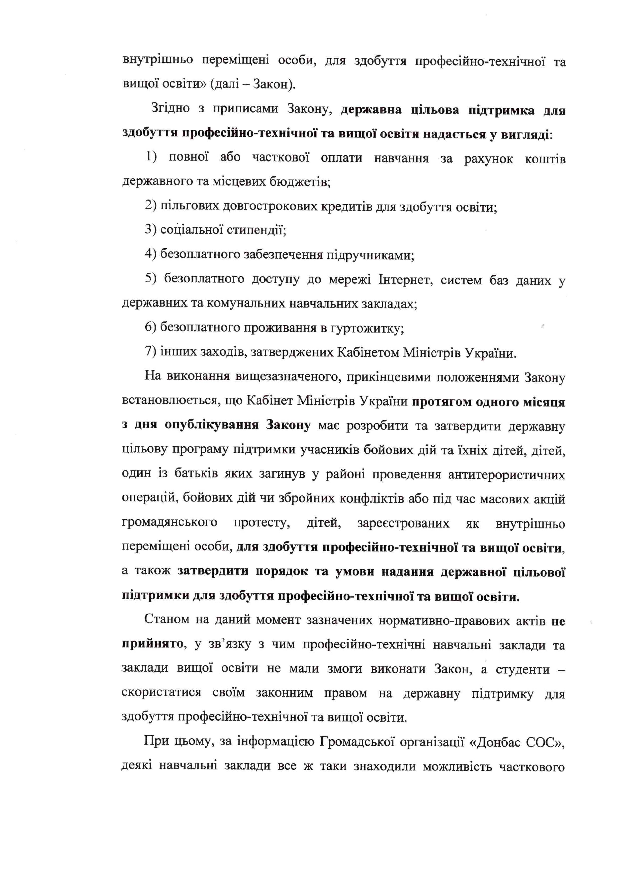 С лета 2015 года продолжается эпопея с неисполнением Закона, которым предоставляются ряд льгот в том числе и для студентов-переселенцев. Закон Украины №425-VIII был принят в мае 2015 года и в течении месяца Кабмин должен был разработать порядок и условия предоставления государственной поддержки для получения профессионально-технического и высшего образования для студентов-переселенцев, участников боевых действий и их детей, а также детей, чьи родители пострадали в районе проведения АТО во время боевых действий или вооруженных конфликтов или при массовых акций гражданского протеста. Однако порядок и условия такой поддержки до сих пор не были утверждены и по сути Закон до сих пор не работает.
