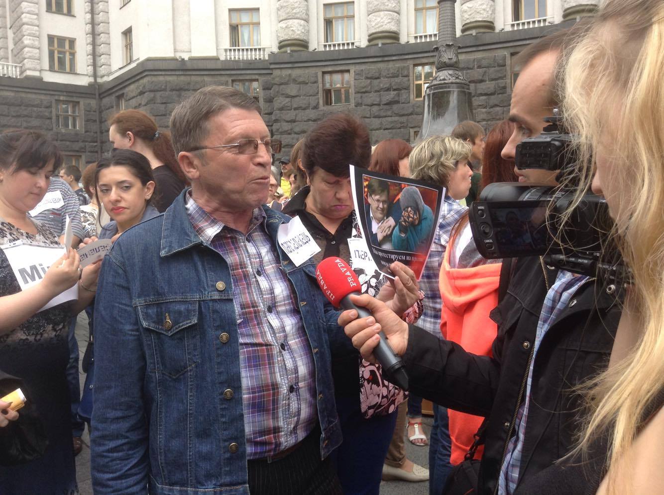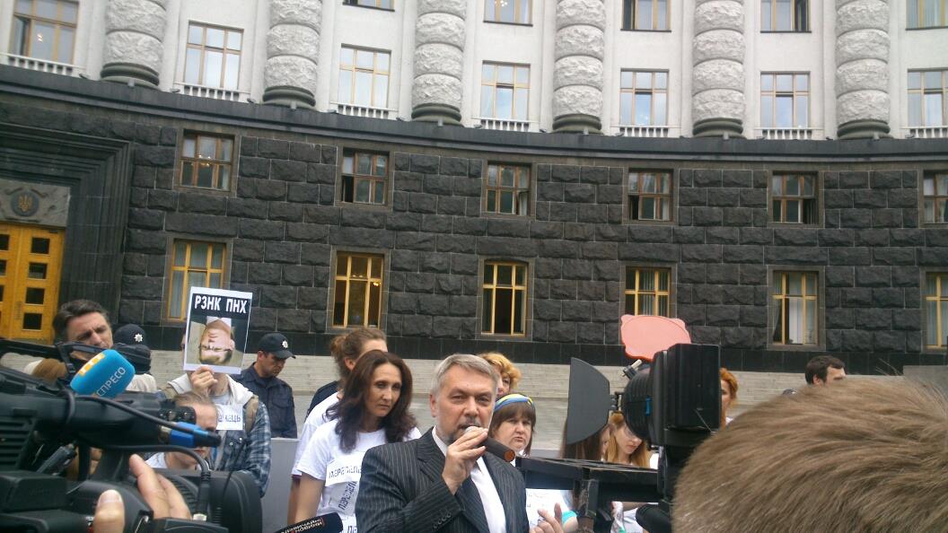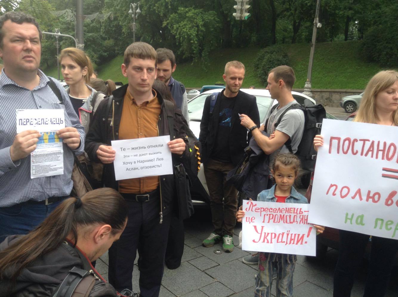 Разом з переселенцями під стіни Кабмінц вийшло декілька народних депутатів, представник омбудсмена. З’явився навіть очільник ДонОДА М. Жебрівський в блакитному костюмі.