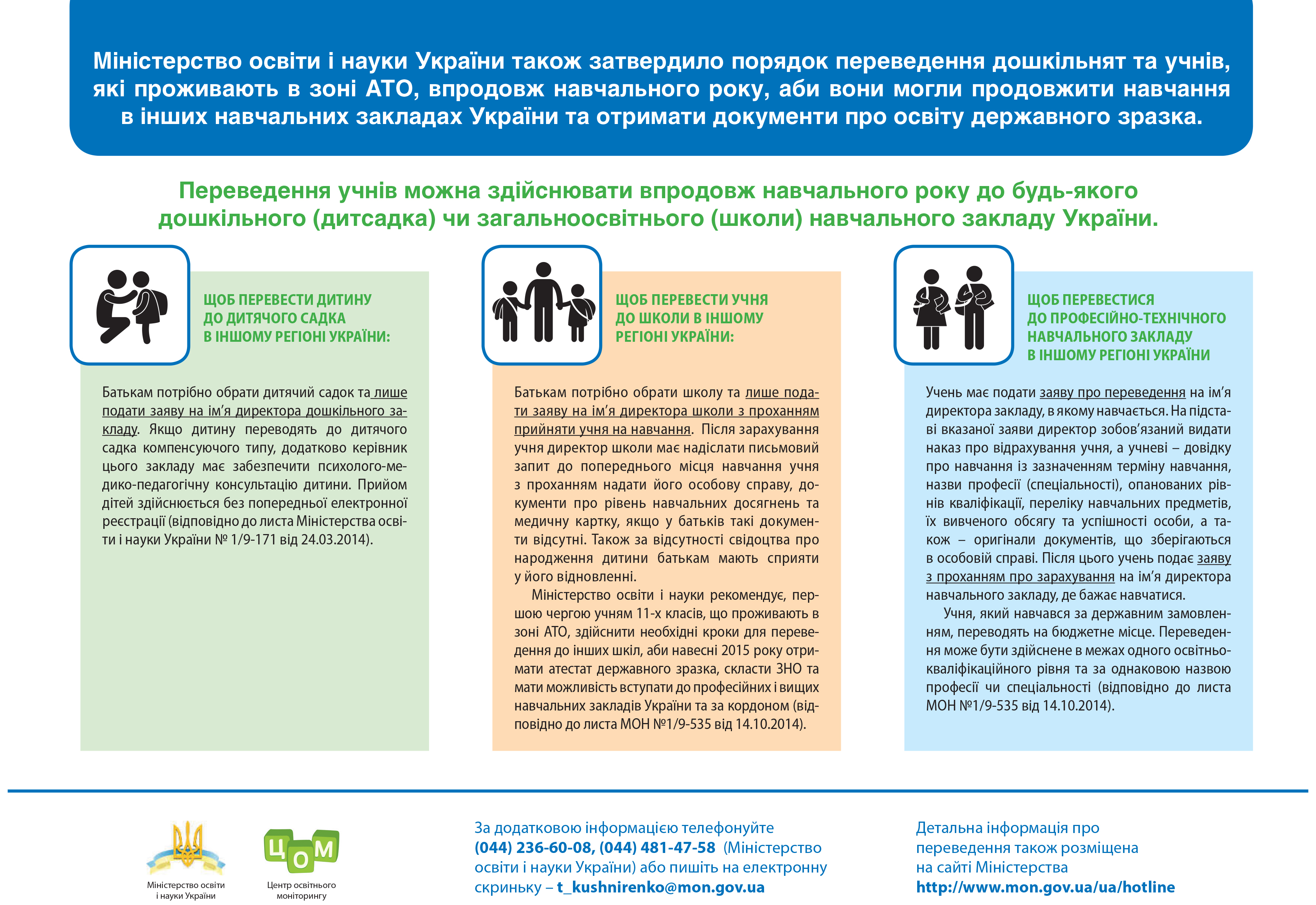 Для перевода ученика в школу на подконтрольной Украине территории необходимо подать заявление на имя директора с просьбой принять ученика на обучение. Ученики принимаются на протяжении всего учебного года. Одной из проблем, с которыми сталкиваются наши абоненты, является потеря либо порча документов об образовании. Согласно письму Минобразования № 1/9-366 от 18.07.2014 ученики принимаются в школу и при отсутствии соответствующих документов о базовом или полном общем среднем образовании и приложений к ним. При этом учебное заведение должно содействовать в вопросе восстановления таких документов. В случае, если у ребенка нет возможности документально подтвердить уровень образования, учебное заведение самостоятельно определяет такой уровень, организовывая специальную комиссию, которая составляет упражнения по каждому предмету, результат такого оценивания оформляется специальным протоколом (согласно письму МОН №1 / 9-535 от 14.10.2014).