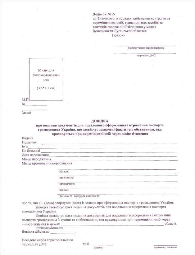 осіб, що народилися в 1998 році і пізніше, і оформлюють паспорт громадянина України — при пред’явленні довідки ДМС України про здачу документів на отримання паспорта, яка виглядає так: