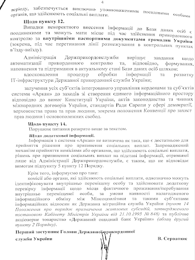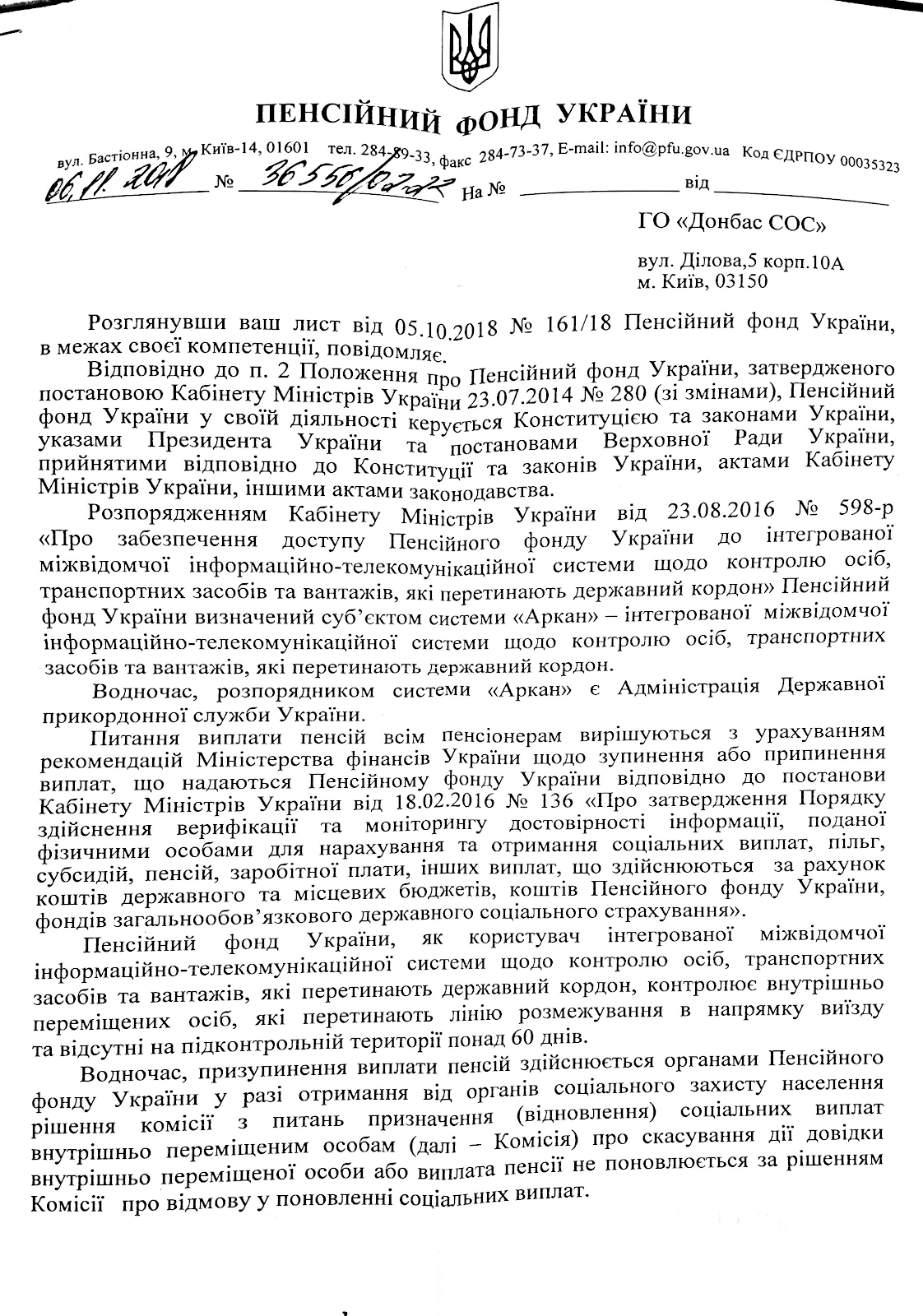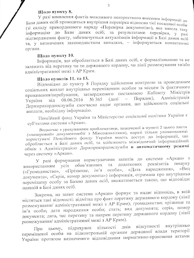 Если вы видите наши вопросы и сравниваете с ответом ПФУ, то понимаете: большинство вопросов осталось без внимания. ПФУ подтверждает, что является пользователем “інтегрованої міжвідомчої інформаційно-телекомунікаційної системи щодо контролю осіб, транспортних засобів та вантажів, які перетинають державний кордон”, что по сути соответствует определению на законодательном уровне — системе Аркан, и контролирует переселенцев, которые пересекают линию разграничения в направлении выезда и отсутствуют на подконтрольной территории более 60 дней, НО!!! любая приостановка выплат только после получения информации от органов социальной защиты населения (УТСЗН) об отмене справки ВПЛ. Другими словами первоисточник “список Аркан”, со слов ПФУ — органы социальной защиты населения (УТСЗН) во главе (в части социальной политики, мы прекрасно помним, что наполовину данные субъекты подчиняются местным властям) с Минсоцполитики. А Минсоцполитики молчит…