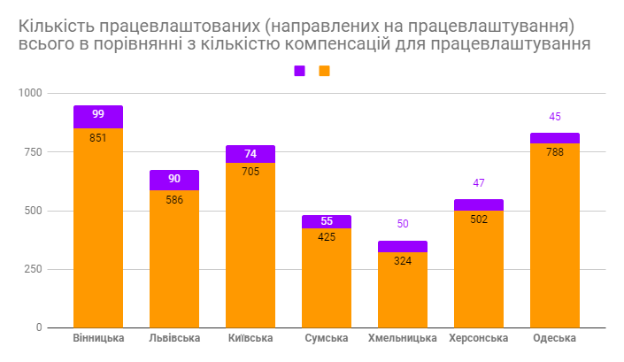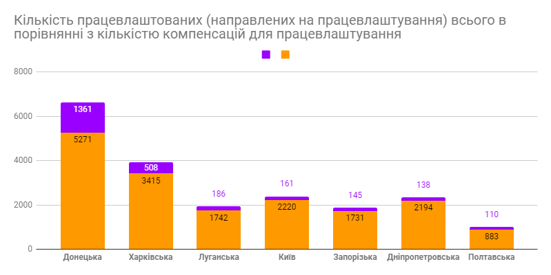 Лідерами із працевлаштування стали Донецька, Харківська та Луганська області. В графіках, наведених нижче можна порівняти загальну кількість компенсацій для роботодавців за працевлаштування ВПО (фіолетові стовпчики) із загальною кількістю працевлаштованих (направлених на працевлаштування) ВПО у відповідних центрах зайнятості (жовті стовпчики).