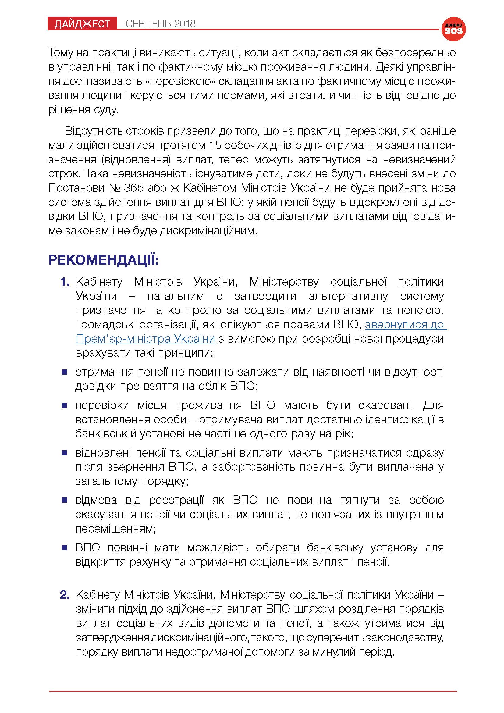 1. Затвердити альтернативну систему призначення та контролю за соціальними виплатами та пенсією. Громадські організації, які опікуються правами ВПО, звернулися до Прем’єр-міністра України з вимогою при розробці нової процедури врахувати низку принципів, які мають забезпечити недискримінаційність підходу до ВПО та відповідність чинному законодавству.