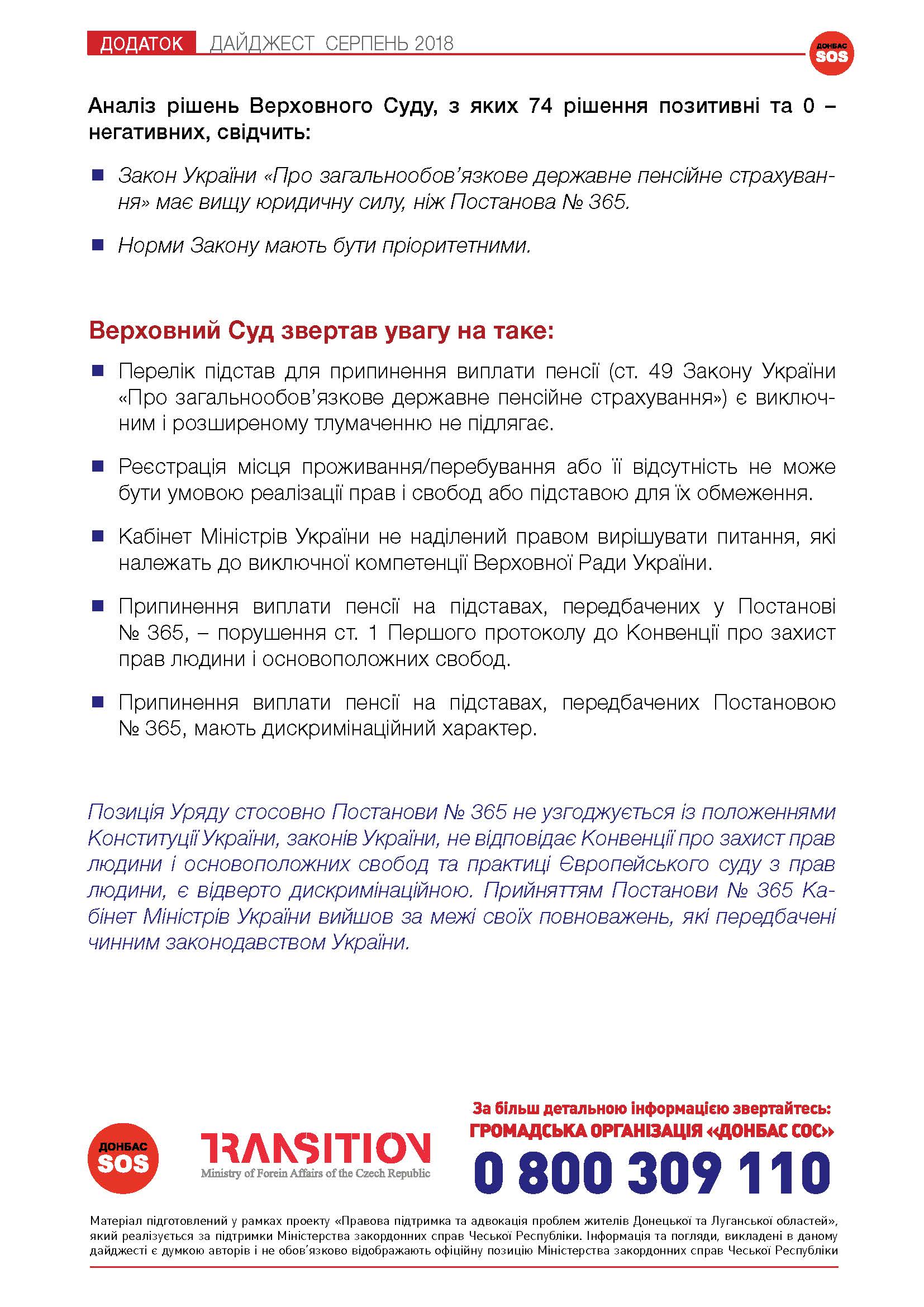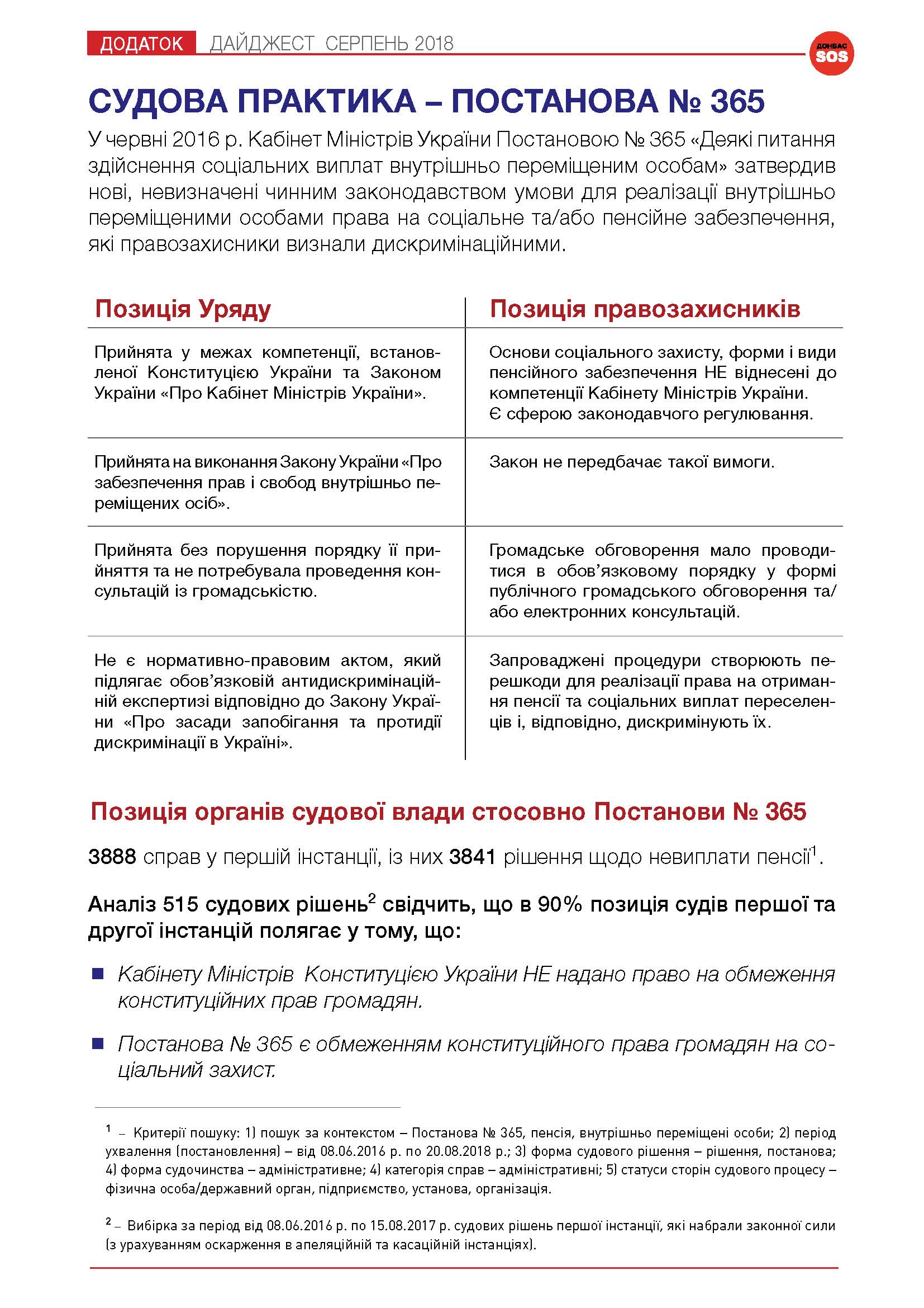 За перше півріччя 2018 р. Питання пов’язані з проблемами доступу громадян до своїх пенсійних та соціальних виплат через дію Постанови № 365, займають провідні позиції.  Крім того, їхній відсоток значно зріс у травні–квітні з прийняттям постанови Кабінету Міністрів України № 335 «Про внесення змін до постанови Кабінету Міністрів України від 8 червня 2016 р. № 365» – відтепер суми соціальних виплат (та пенсії), які не виплачені за минулий період, мають виплачуватися на умовах окремого порядку. Однак такий порядок досі не затверджений.