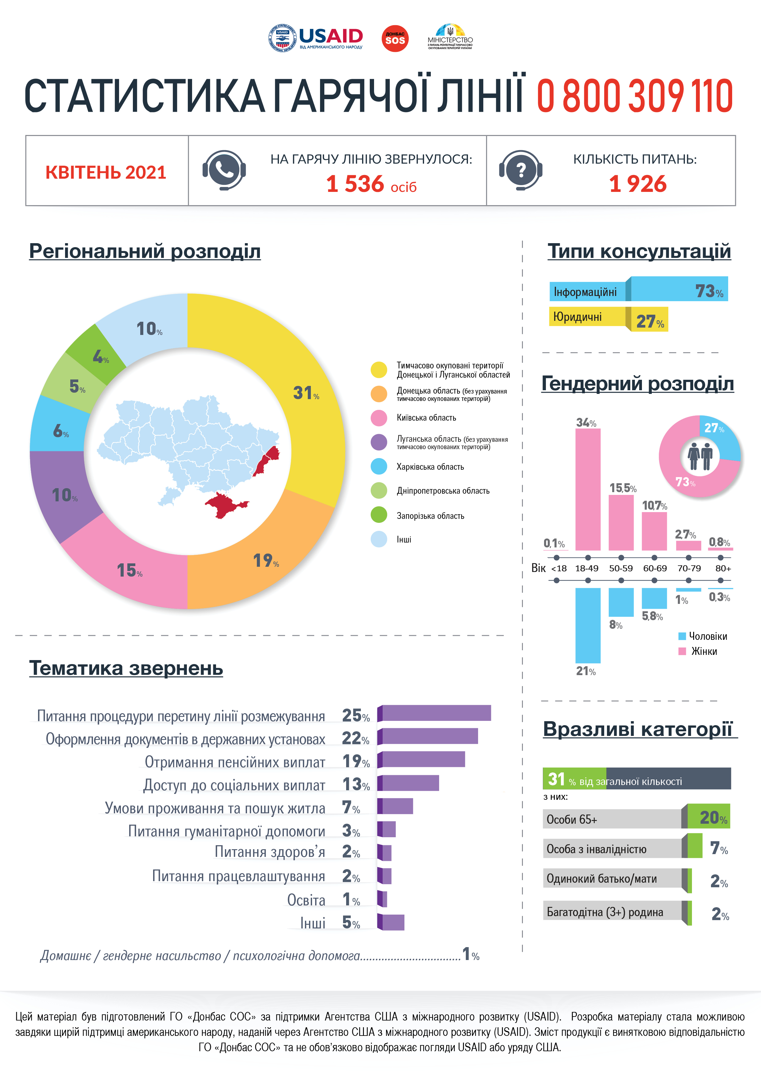Результати роботи Гарячої лінії ГО «Донбас СОС» у квітні 2021 року.