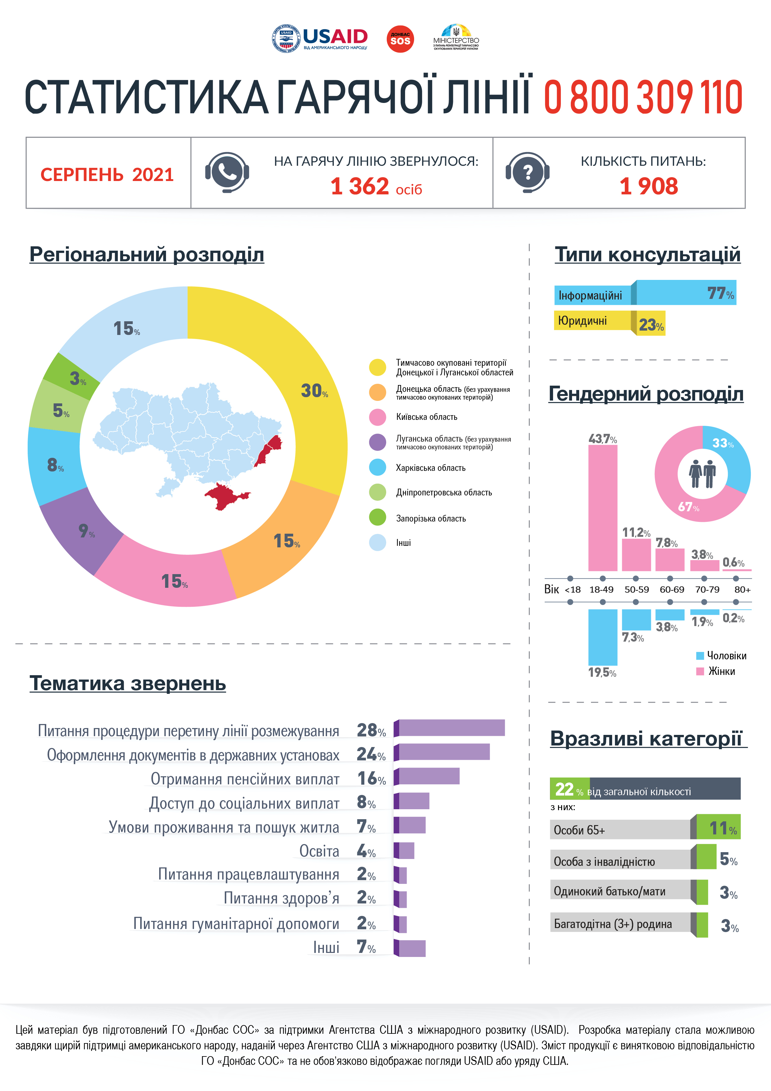 Результати роботи Гарячої лінії ГО «Донбас СОС» у серпні 2021 року.