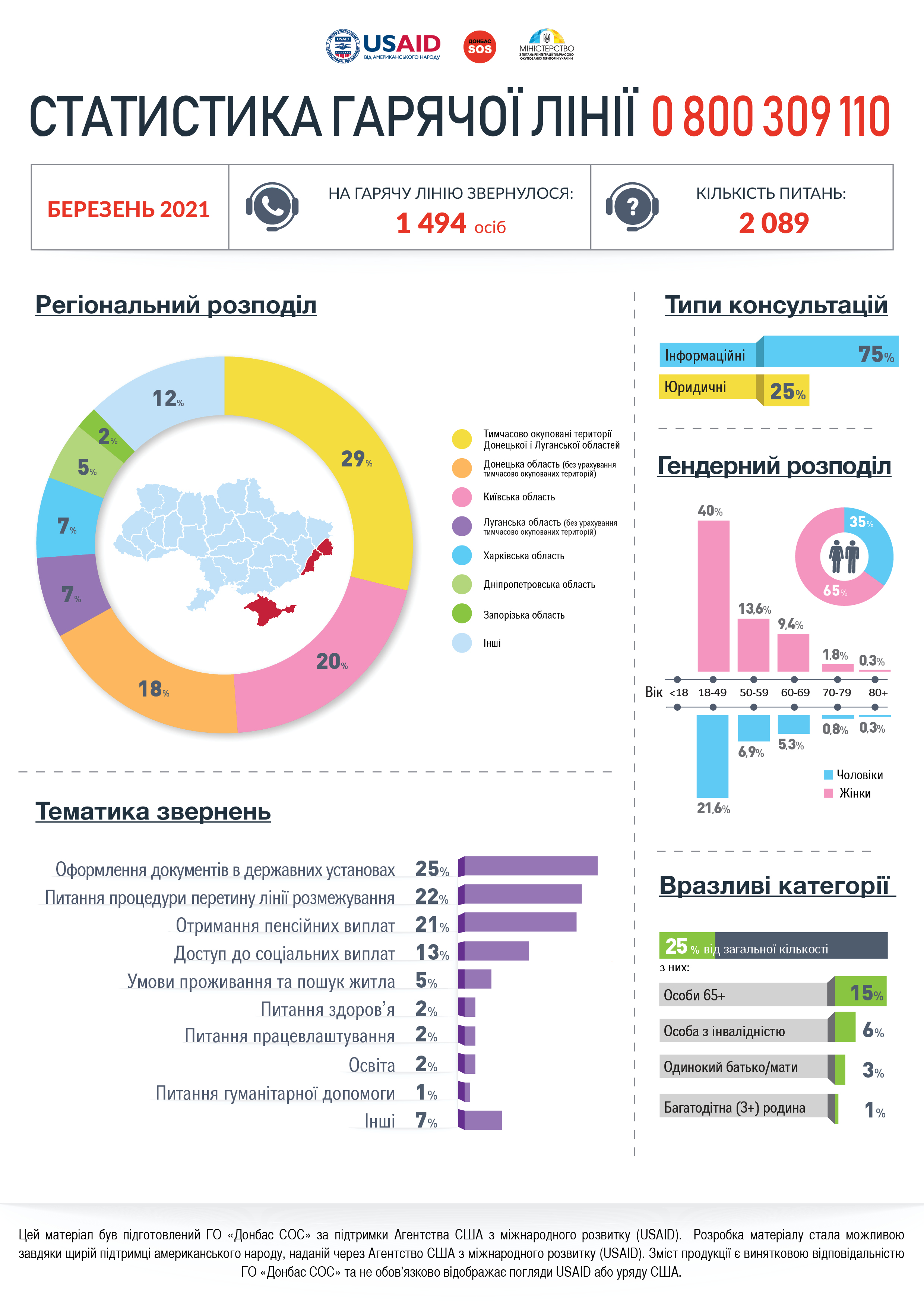 Гаряча лінія в березні 2021 01.04.2021 Гаряча лінія, Новини, Общее Результати роботи Гарячої лінії ГО «Донбас СОС» у березні 2021 року. Англійська версія інфографіки Даний проєкт «Гаряча лінія для населення, яке постраждало від збройної агресії РФ» виконується за підтримки Агентства США з міжнародного розвитку (USAID).