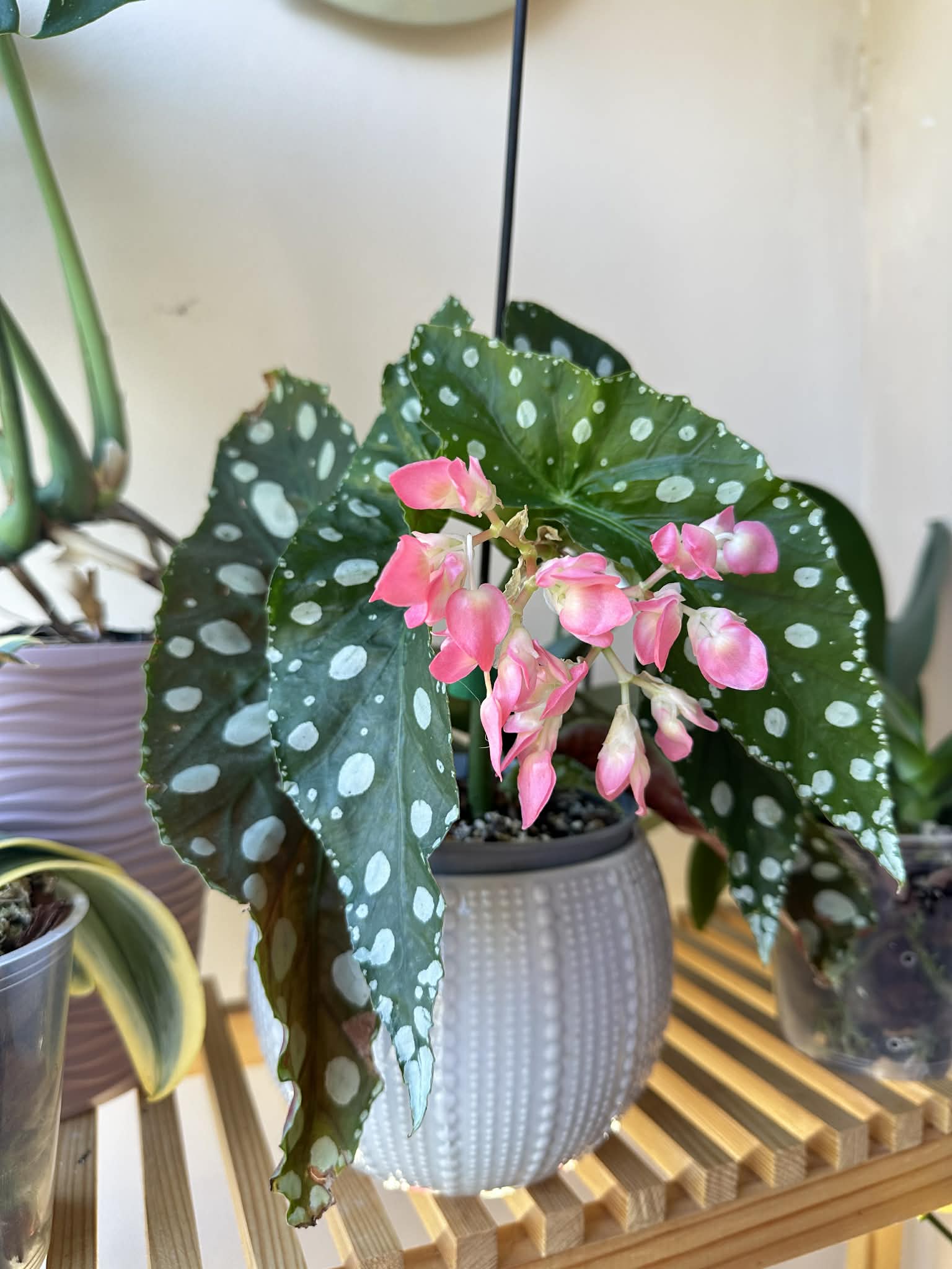 «Вивчати всю інформацію, яку тільки можна і не можна про це хобі, купляти все, що треба для нього. Займатись ним тиждень, а потім кидати, — пояснює вона. — Але деякі трохи затримались… Наприклад, зараз я колекціоную відносно рідкі домашні рослини. Є в мене гібрид антуріума Crystallinum і Forgetii white stripes, антуріум Warocqueanum, філодендрон Splendid, Монстера «Тайське сузірʼя» Бегонія Maculata Megadot (на фото)».