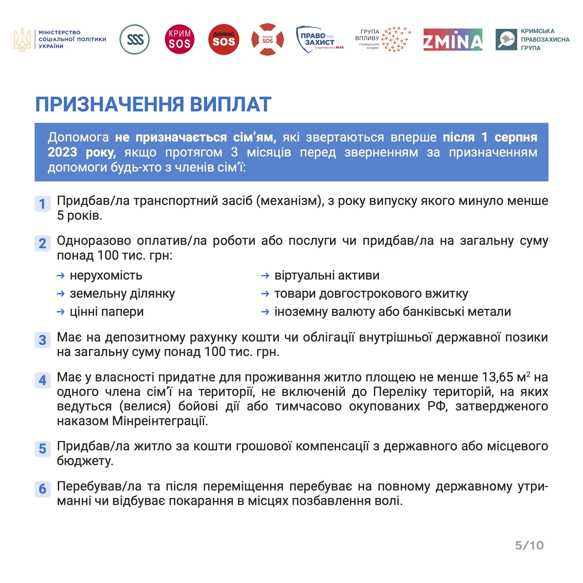 Починаючи з серпня 2023 року, допомога на проживання була скасована особам, які виїхали за кордон, та не повернулися в Україну до 1 серпня 2023 року. Раніше не було законодавчих підстав для поновлення виплат таким громадянам.