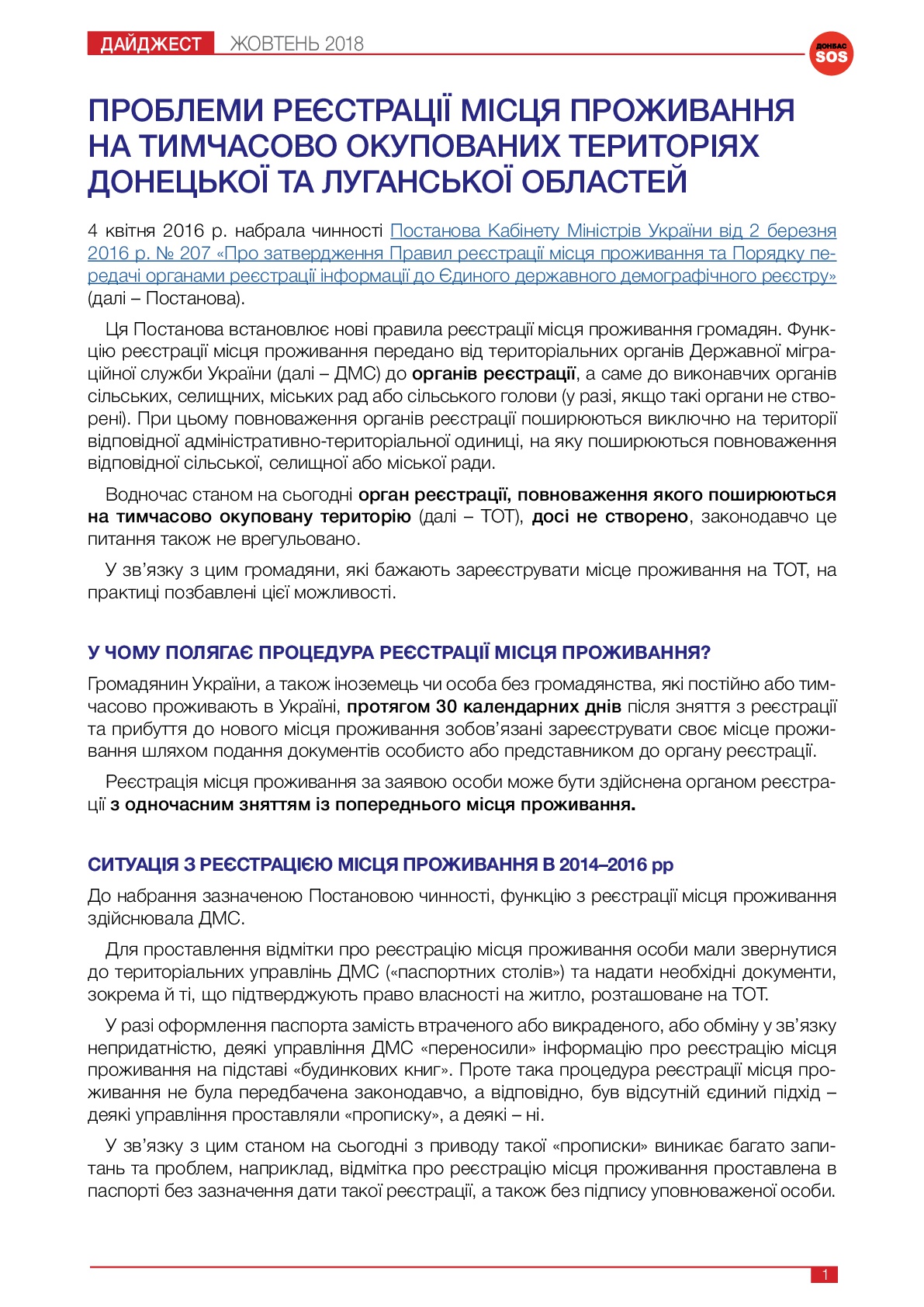 4 квітня 2016 р. набрала чинності Постанова Кабінету Міністрів України від 2 березня 2016 р. № 207 «Про затвердження Правил реєстрації місця проживання та Порядку передачі органами реєстрації інформації до Єдиного державного демографічного реєстру» (далі – Постанова).