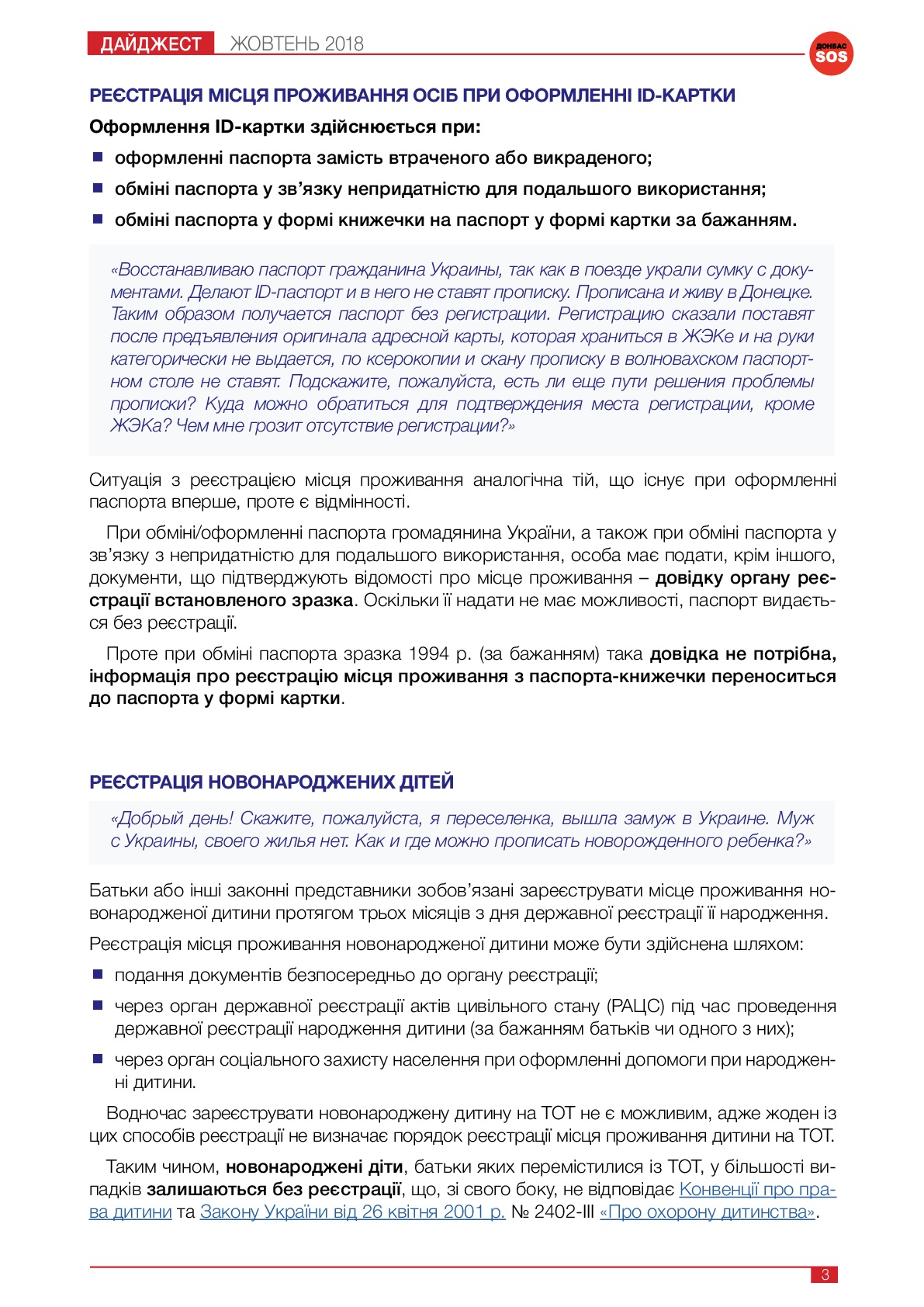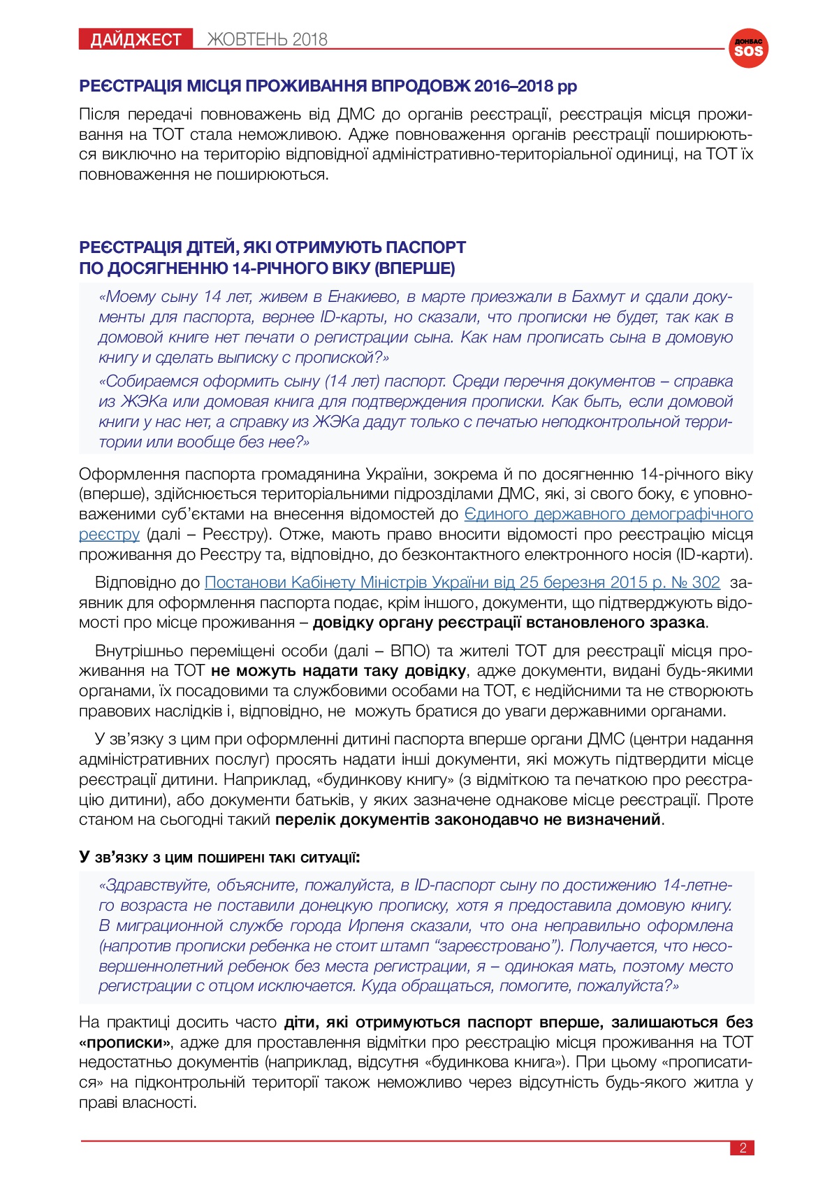 «Здравствуйте, объясните, пожалуйста, в ID-паспорт сыну по достижению 14-летнего возраста не поставили донецкую прописку, хотя я предоставила домовую книгу. В миграционной службе города Ирпеня сказали, что она неправильно оформлена (напротив прописки ребенка не стоит штамп “зареєстровано”). Получается, что несовершеннолетний ребенок без места регистрации, я – одинокая мать, поэтому место регистрации с отцом исключается. Куда обращаться, помогите, пожалуйста?»