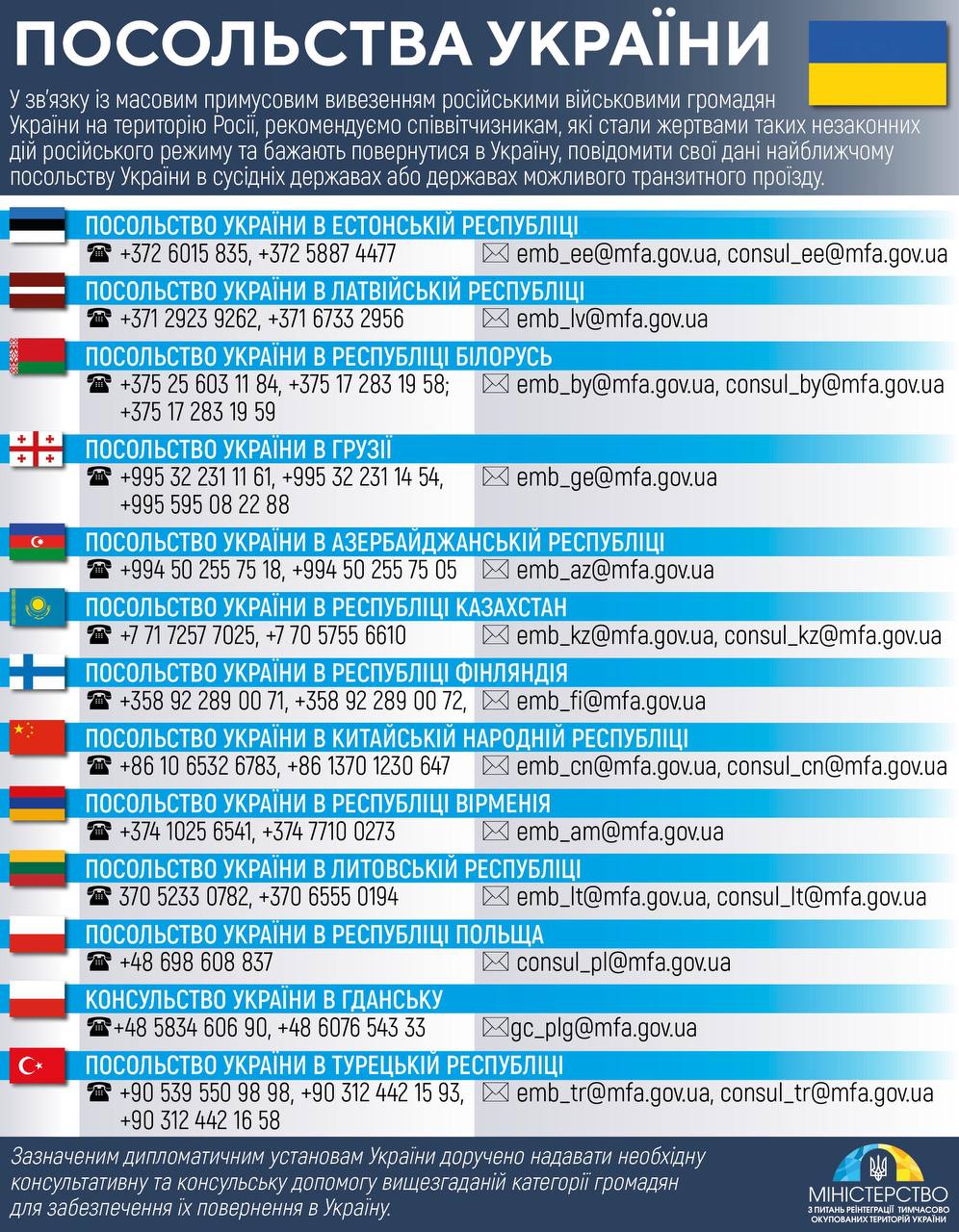 Важливо! Якщо вас незаконно депортували на територію Російської Федерації, зверніться до посольств України за такими контактами: