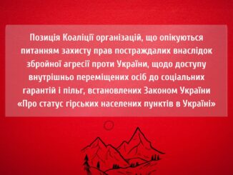 Позиція Коаліції організацій, що опікуються питанням захисту прав постраждалих внаслідок збройної агресії проти України, щодо доступу внутрішньо переміщених осіб до соціальних гарантій і пільг, встановлених Законом України «Про статус гірських населених пунктів в Україні»