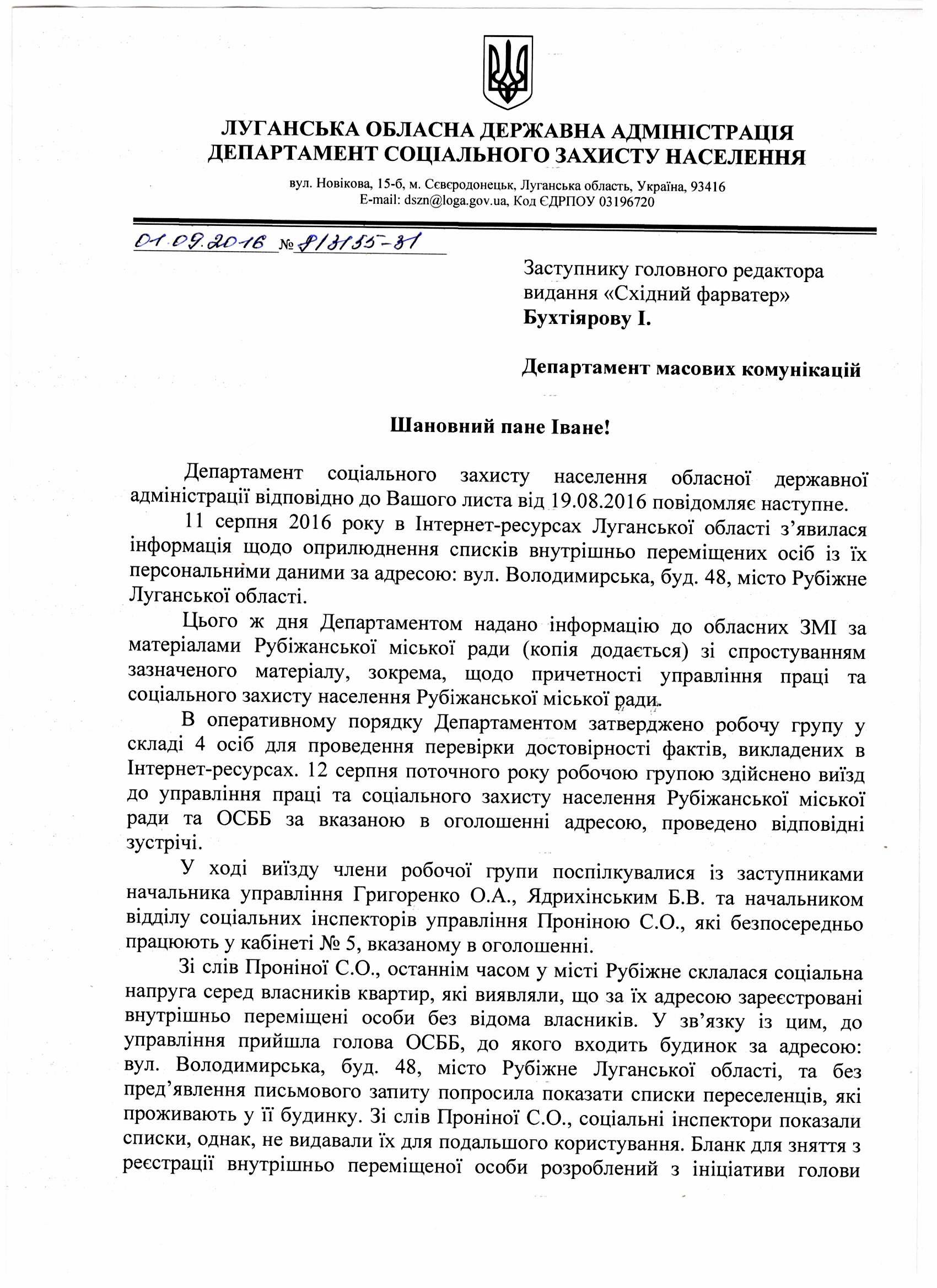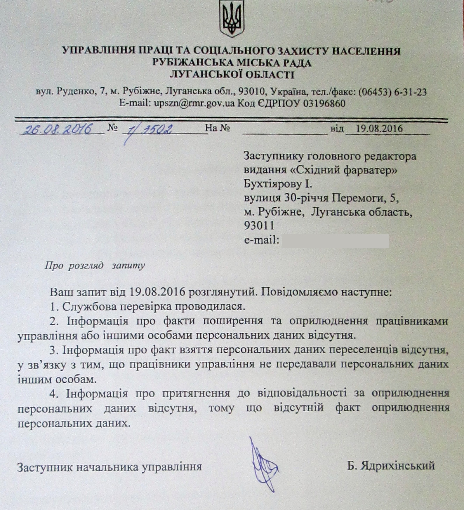 Согласно ответу на запрос «Восточного фарватера», управление труда и социальной защиты населения Рубежанского городского совета,провело служебную проверку, фактов передачи персональной информации обнаружено не было.