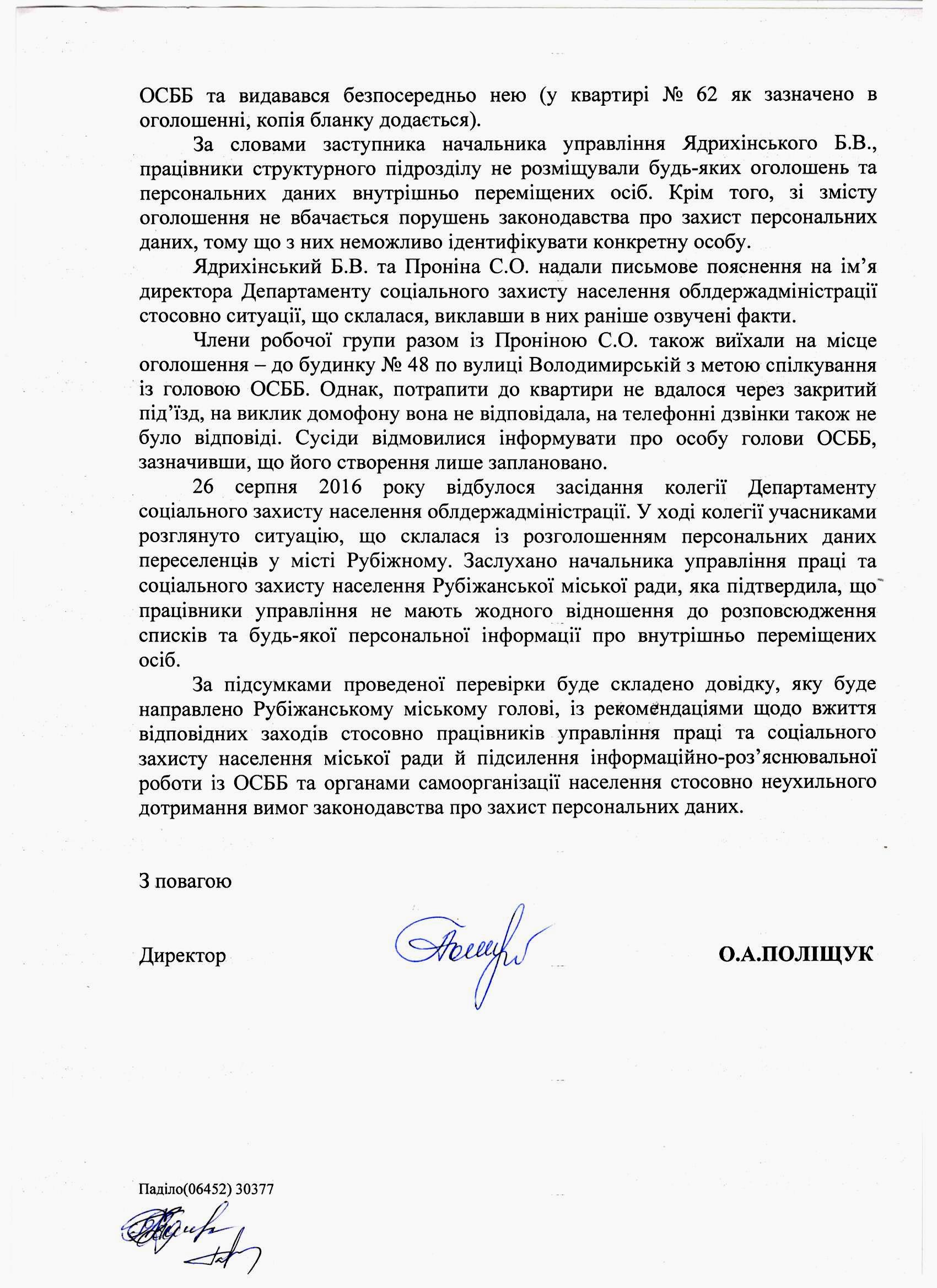 «По словам заместителя начальника управления Ядрихинского Б.В., работники структурного подразделения не размещали никаких объявлений и персональных данных внутренне перемещенных лиц. Кроме того, в содержании объявления не просматривается нарушение законодательства о защите персональных данных, поскольку по ним невозможно идентифицировать конкретное лицо».