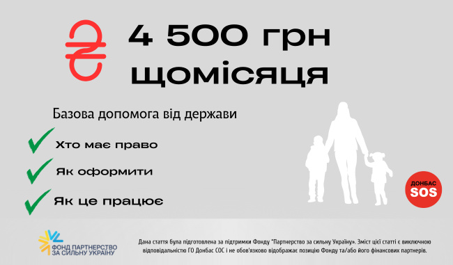Бюджет: кошти загального фонду державного бюджету (програма 2501540 «Підтримка малозабезпечених сімей») і інші дозволені джерела. Базова сума — 4 500 грн (може збільшуватися залежно від складу сім’ї та доходів).