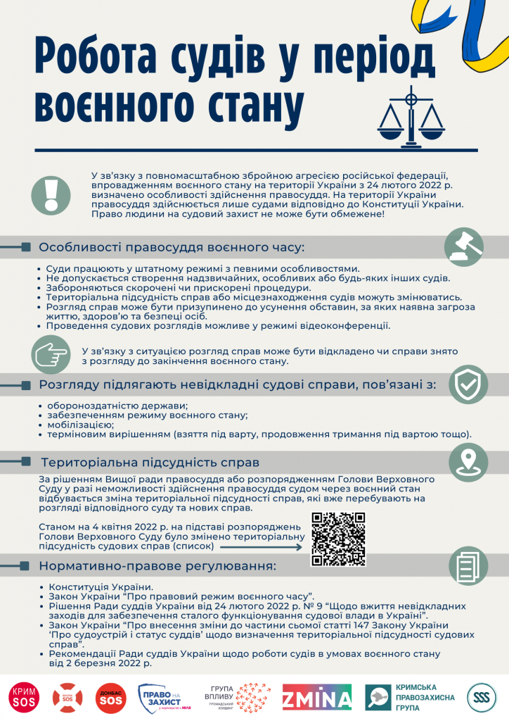 У зв’язку з повномасштабною збройною агресією РФ, впровадженням воєнного стану на території України з 24 лютого 2022 р. визначено особливості здійснення правосуддя.