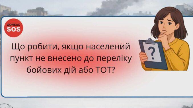 До нашої організації неодноразово надходять звернення щодо відсутності населеного пункту у Переліку територій, на яких ведуться активні чи можливі бойові дії (далі — Перелік). Це напряму впливає на можливість оформити довідку про взяття на облік ВПО та виплати допомоги на проживання, скористатися соціальною стипендією чи спрощеним вступом до навчальних закладів.